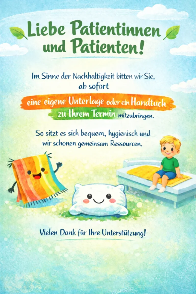 Unsere Praxis arbeitet nach dem Prinzip der Bestellpraxis. Das bedeutet, dass wir bemüht sind, vereinbarte Termine pünktlich einzuhalten. In einer Kinderarztpraxis lässt sich je nach Erkältungswelle oder Notfällen jedoch nicht immer verhindern, dass es zu Verzögerungen kommt. Damit wir den Ablauf so reibungslos wie möglich gestalten können, bitten wir Sie herzlich, alle Kinder vorab anzumelden und alle nicht akuten Termine online zu buchen.